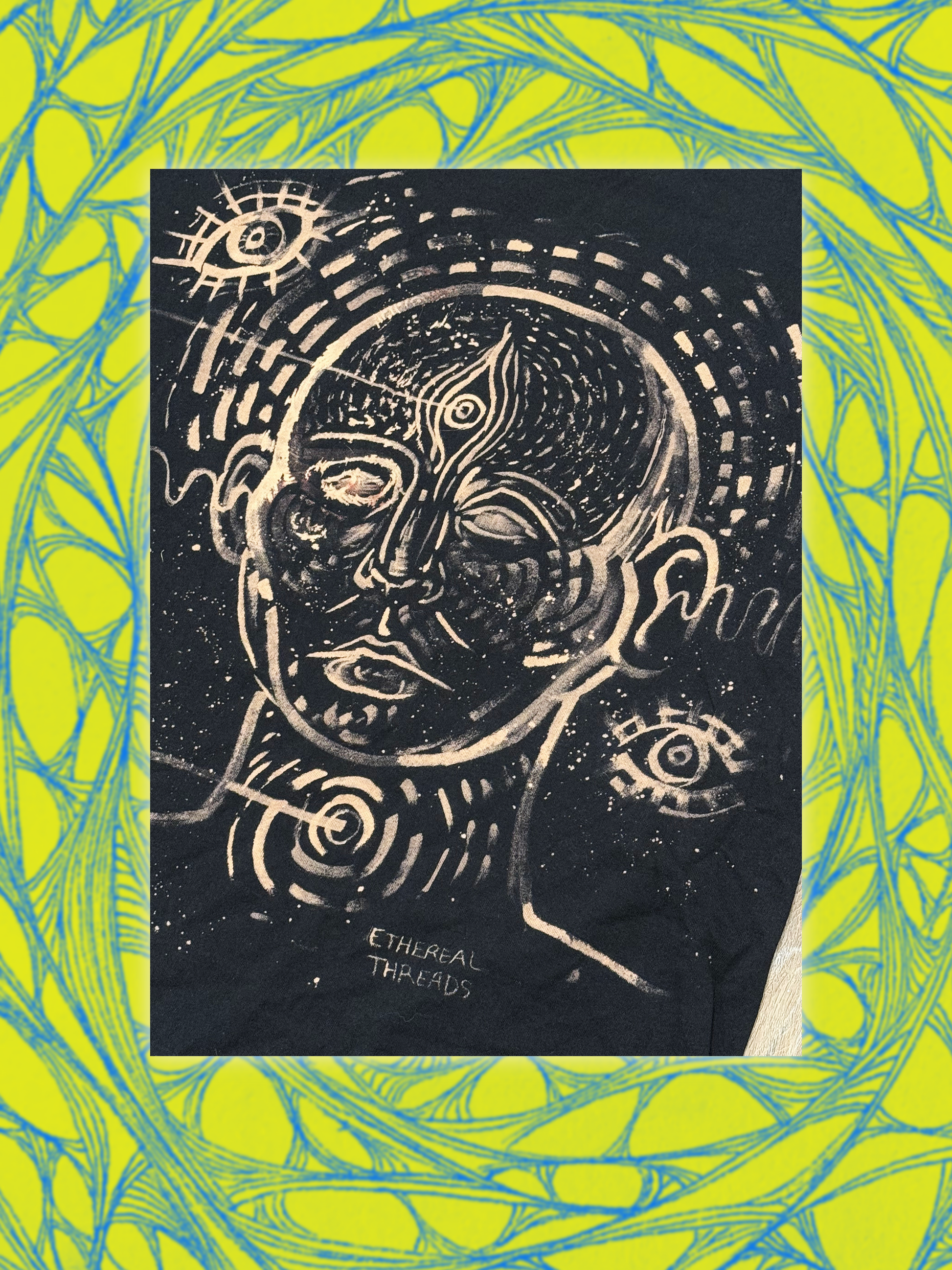 original design, hand painted with bleach, symbolizing higher self (outside of gender, race, social constructs) — simply a radiating form.